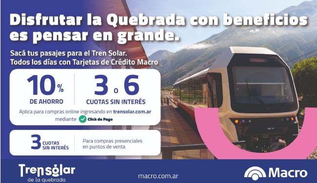 Hasta el 31 de agosto se podrán comprar los pasajes en www.trensolar.com.ar con Tarjetas de Crédito de Banco Macro en 3 y 6 cuotas sin interés.